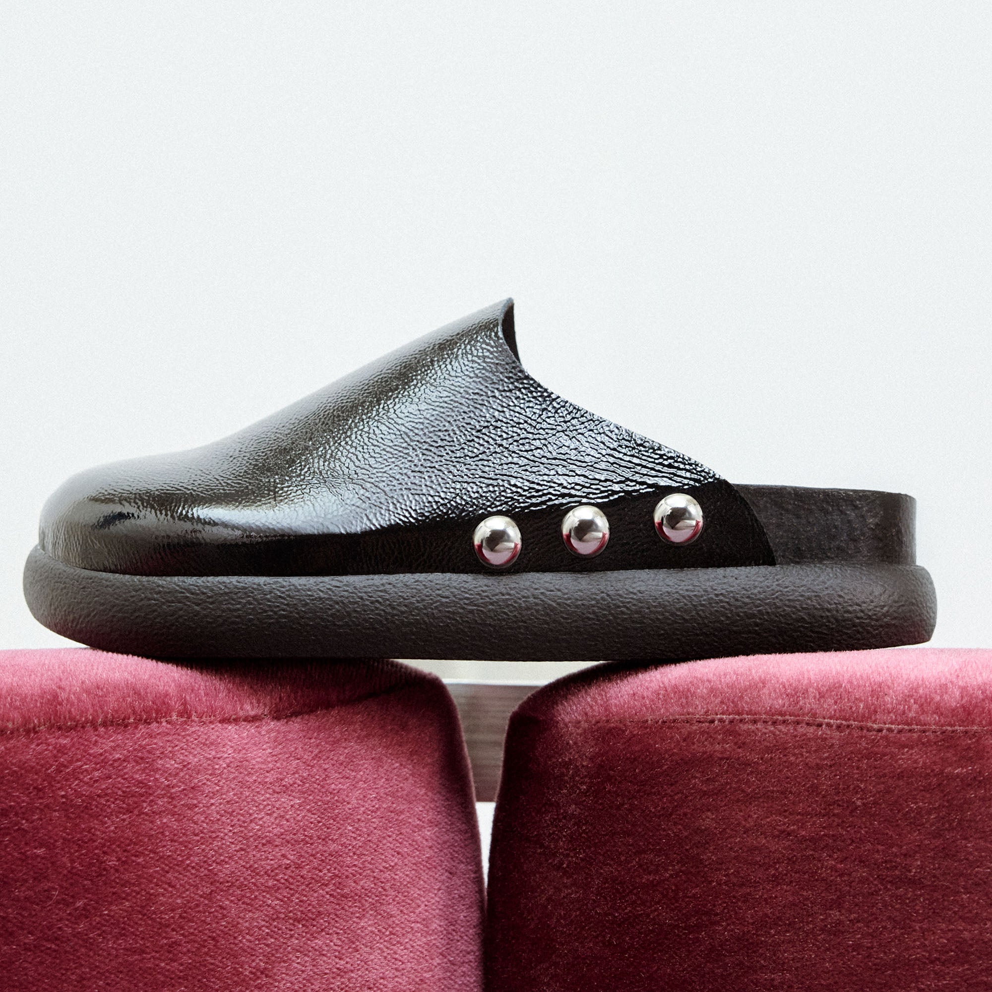 Diese Pantoletten verfügen über eine klobige Sohle für zusätzliche Höhe und Komfort, gepaart mit einem Obermaterial aus Glattleder, das für einen raffinierten und dennoch modernen Look sorgt. Die Außenseite ist mit drei Metallnieten verziert, die der klassischen Pantoletten-Silhouette eine zeitgemäße Note verleihen. Vielseitig und einfach zu stylen, sind sie die perfekte Wahl für den Alltag mit einem gewissen Etwas.