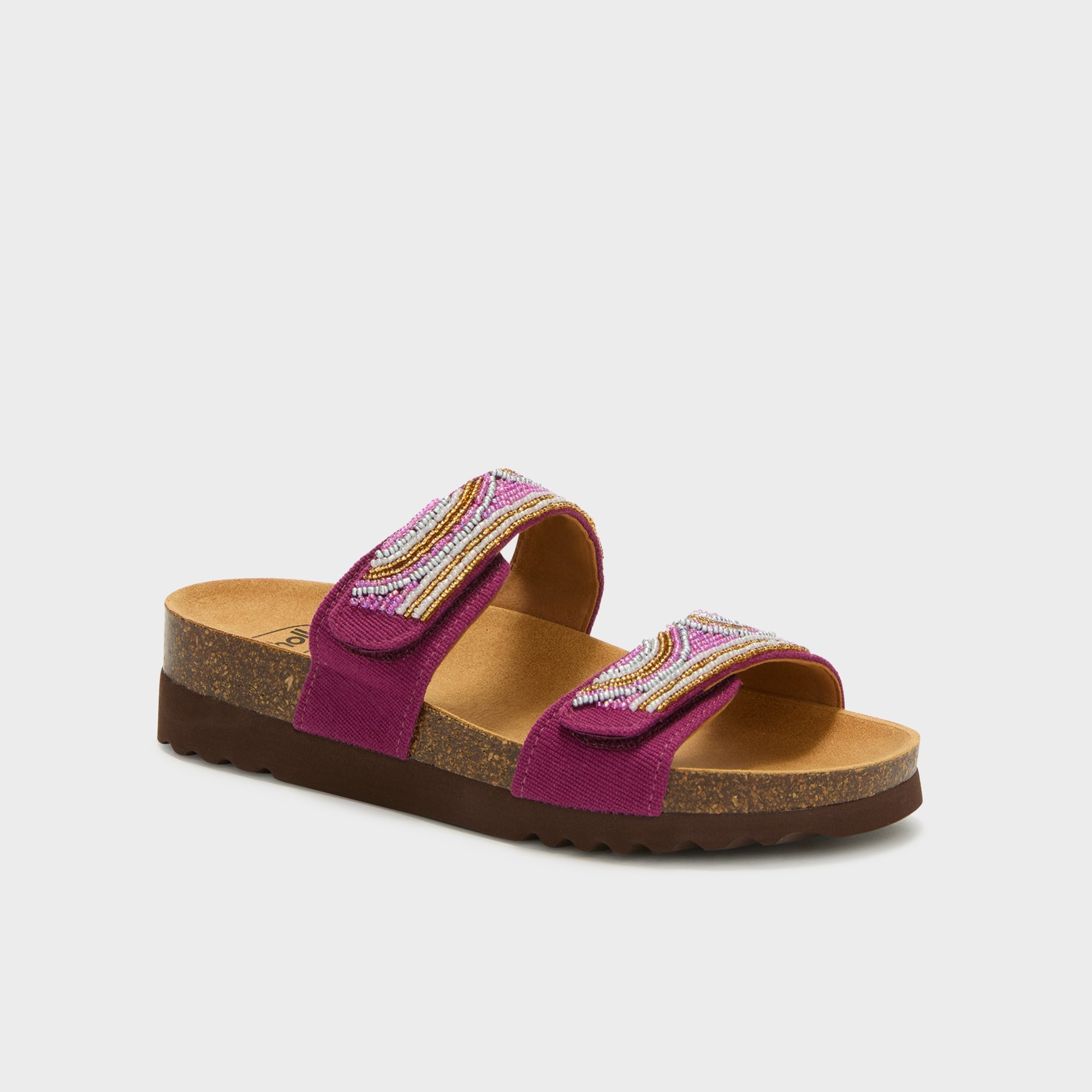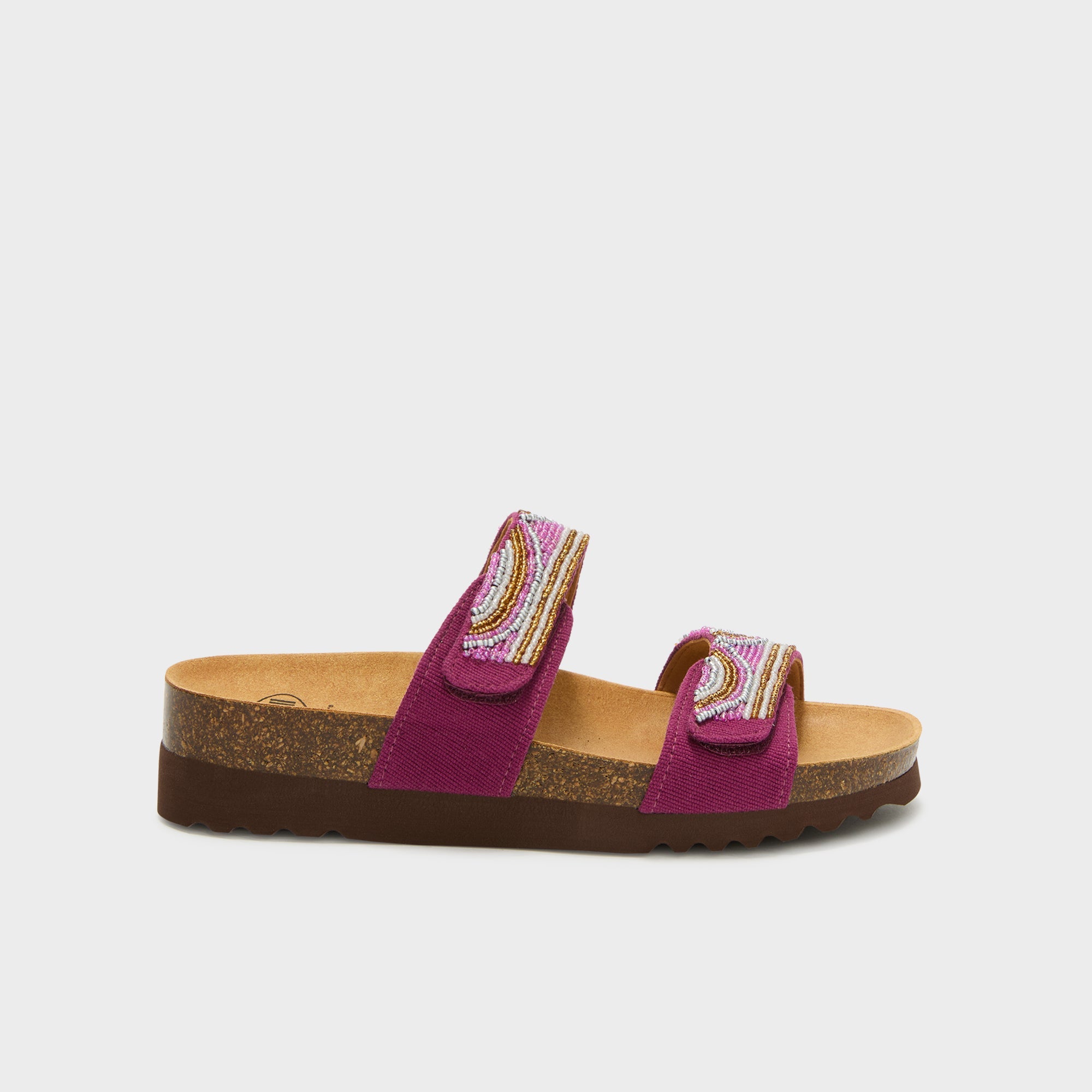Two-band sandal with straps, embellished with hand-sewn beads that give a handcrafted and refined touch. The design enhances the foot with style, combining femininity and attention to detail. Bioprint® is an anatomical footbed designed to support the foot's natural structure and promote proper posture while walking.