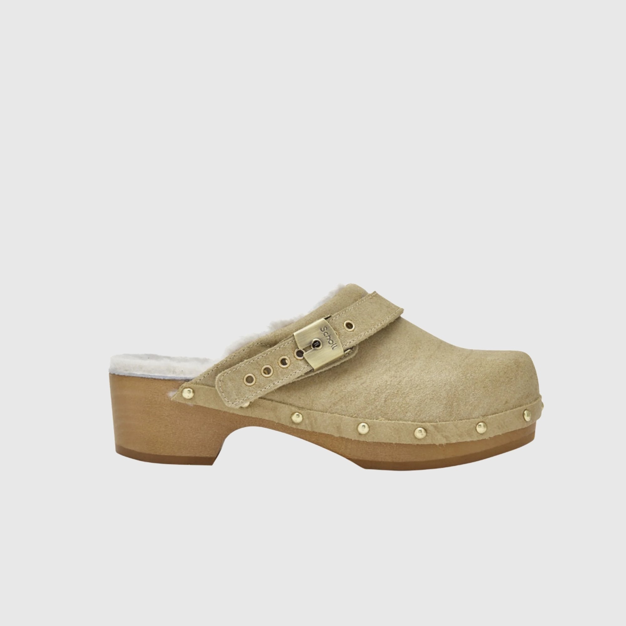 Pescura is the original wooden mule by Scholl, a true 1970s icon and must-have to give a retro touch to any look. Entirely designed and made in Italy with high quality materials such as the fully adjustable leather upper and the soft faux fur lining. In our re-interpretation of the original Pescura model, the rounded sabot-type toe gives the shoe a bold style. Made in Italy.