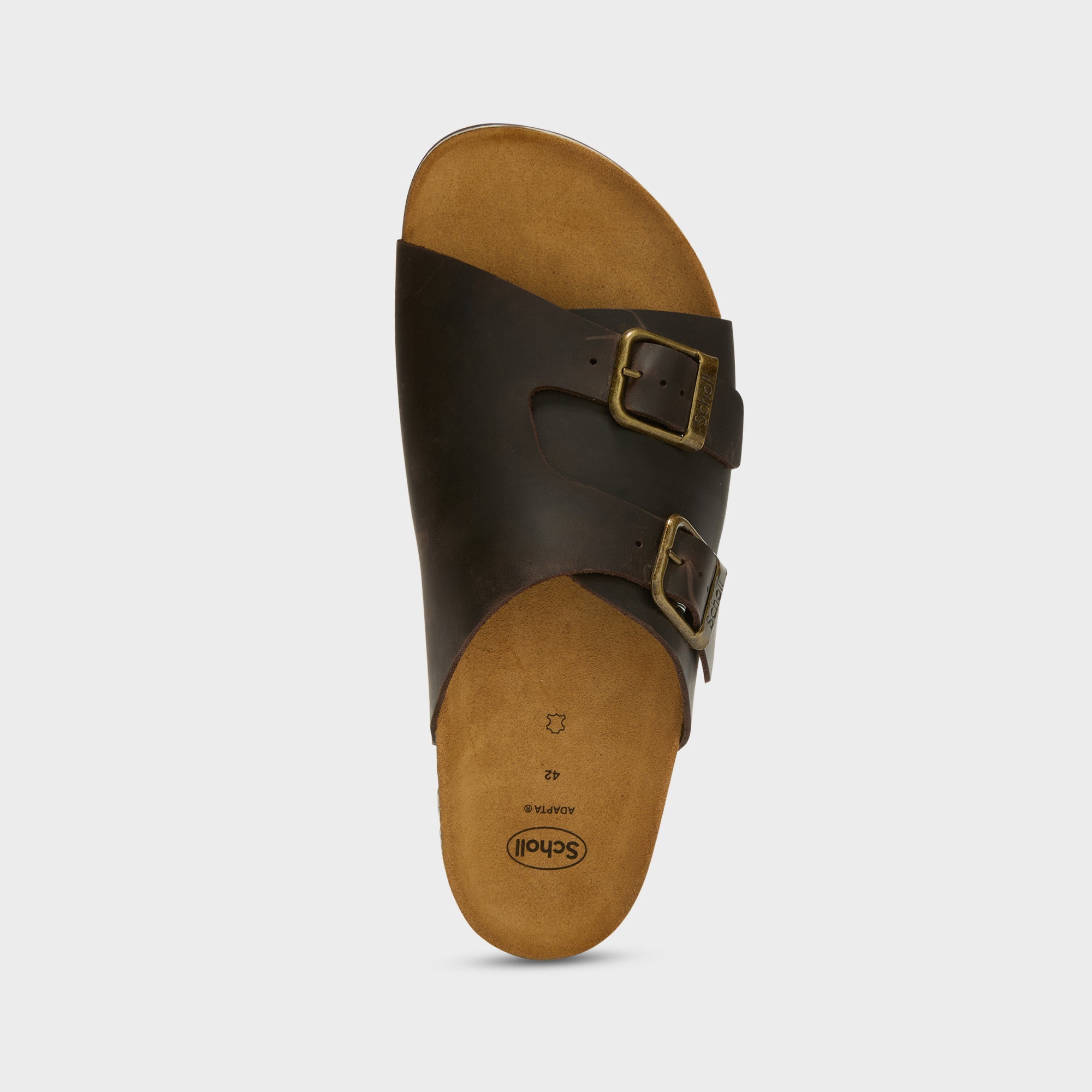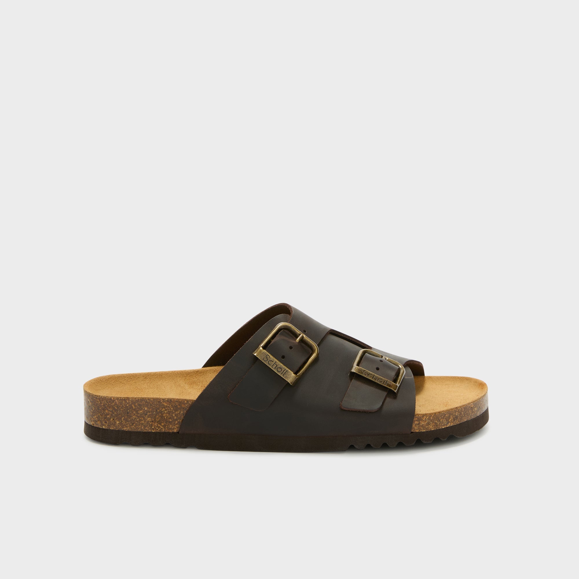 Dorian is a sandal with a clean silhouette, defined by Scholl’s iconic buckle in an antique finish. The leather upper, naturally breathable, features a wide band that wraps the foot and an adjustable structure designed for everyday wear. The cork footbed supports the foot during walking.