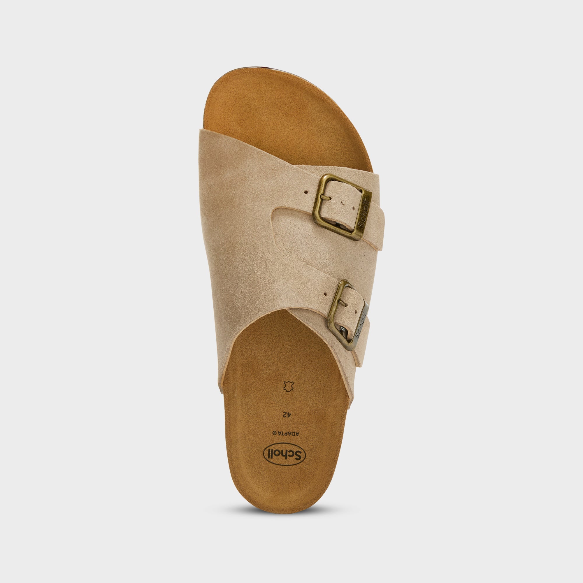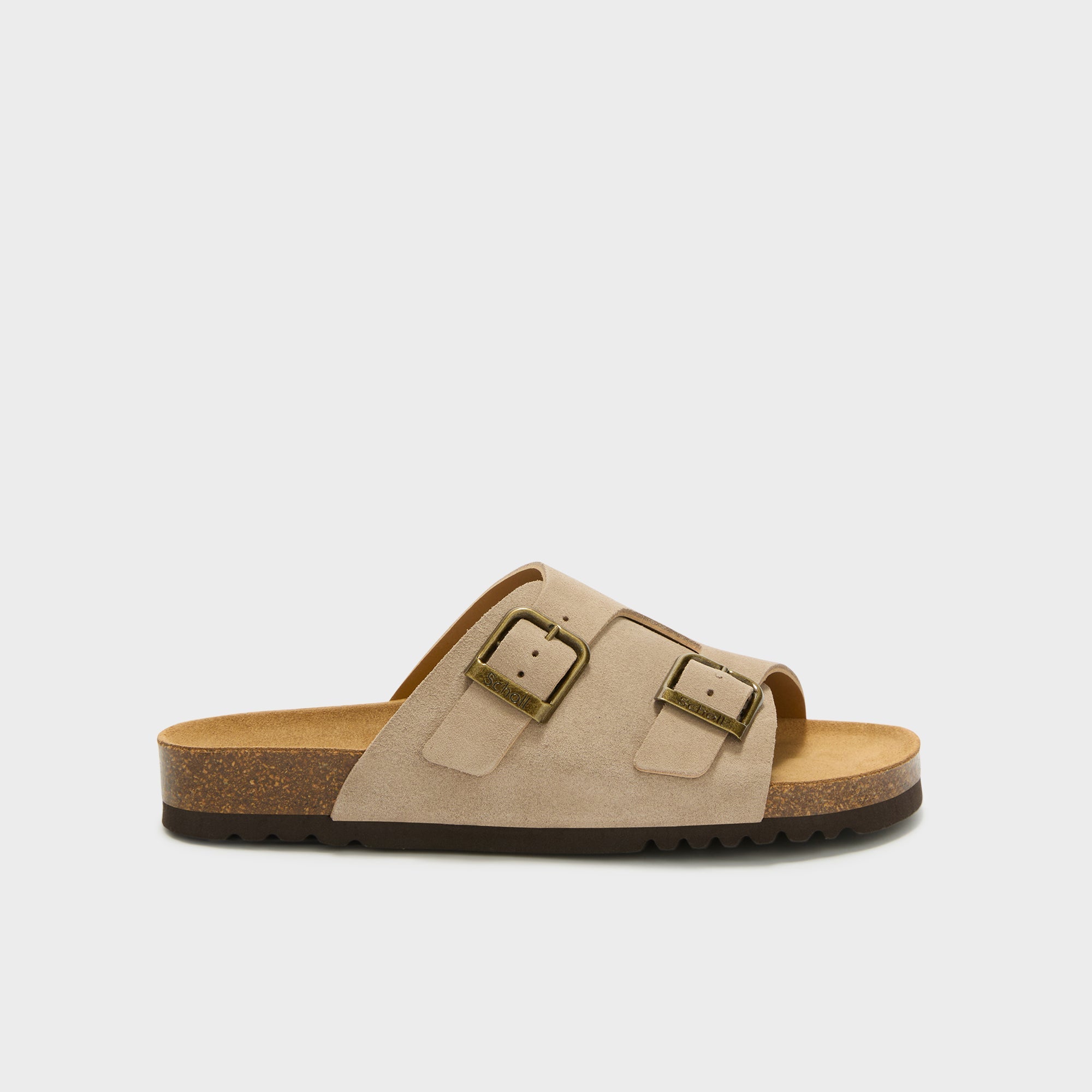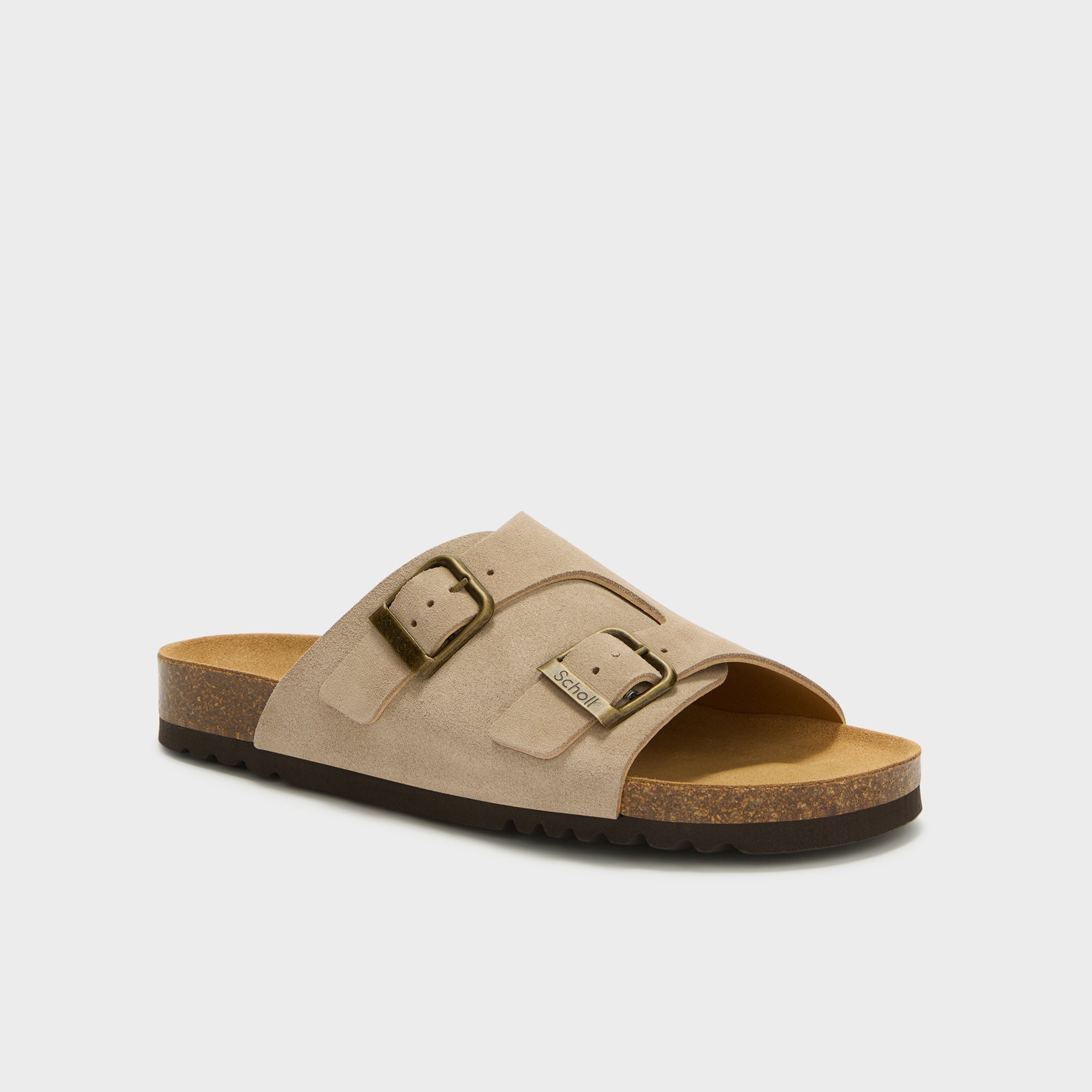 Dorian is a sandal with a clean silhouette, defined by Scholl’s iconic buckle in an antique finish. The leather upper, naturally breathable, features a wide band that wraps the foot and an adjustable structure designed for everyday wear. The cork footbed supports the foot during walking.