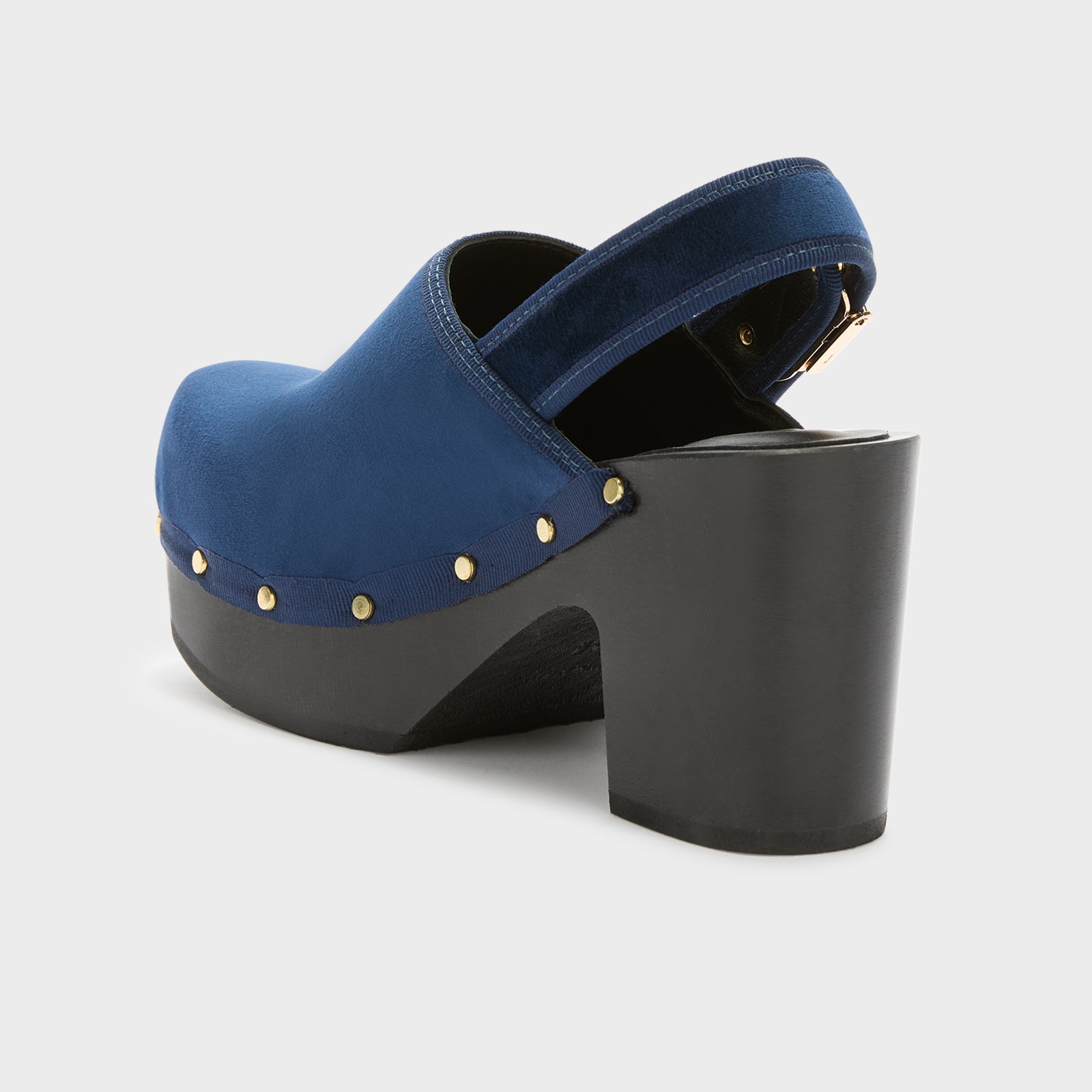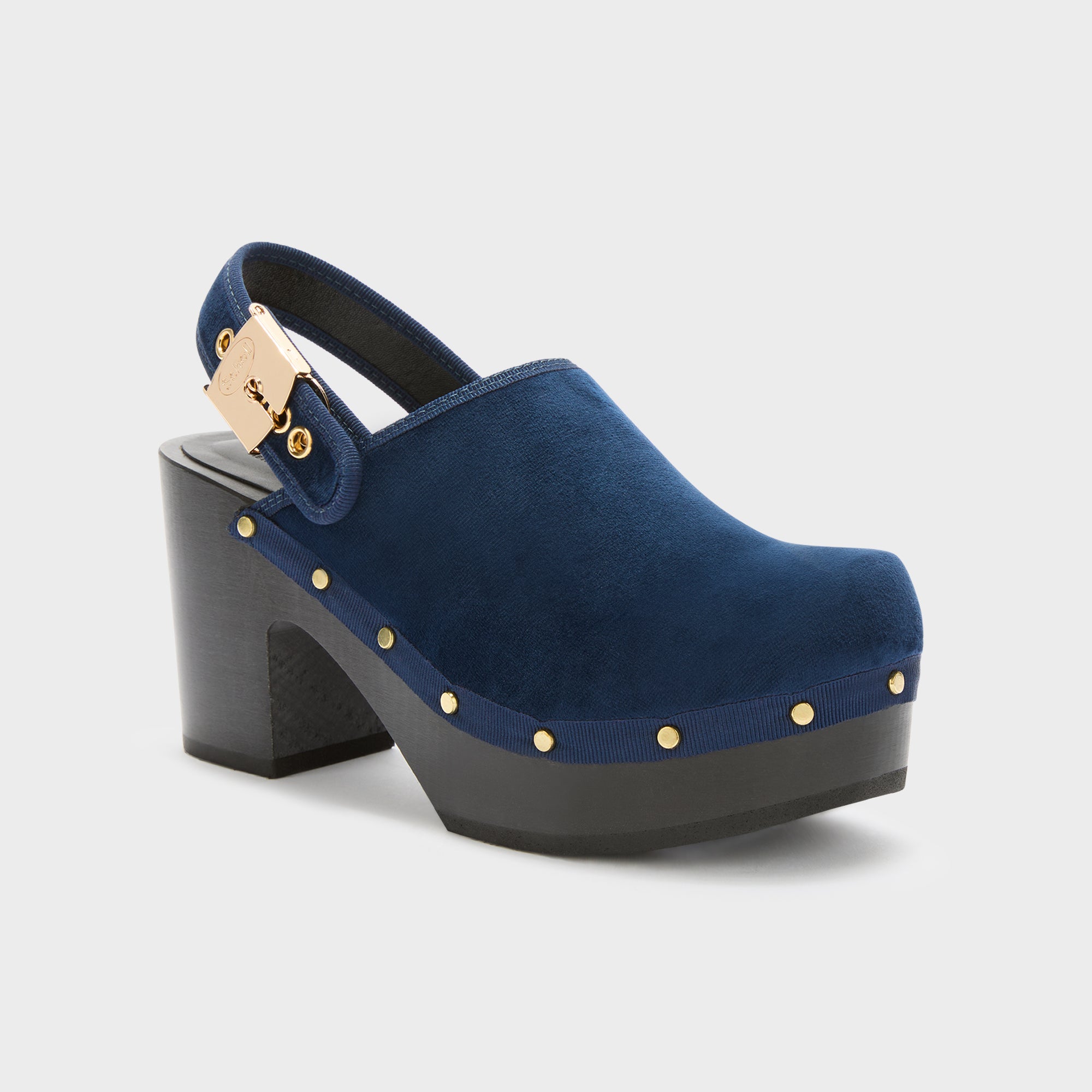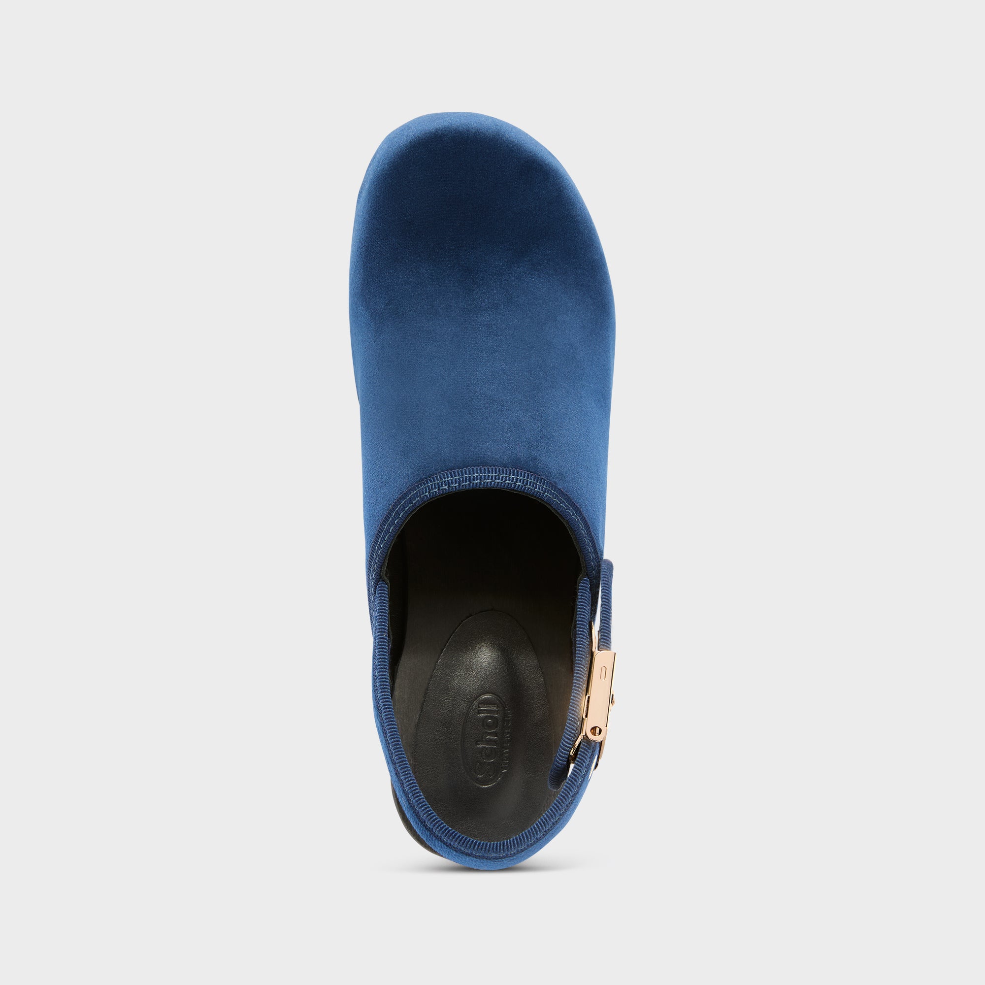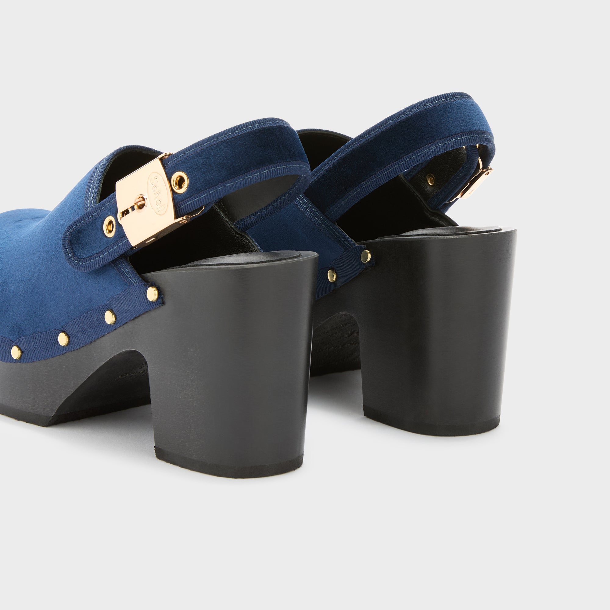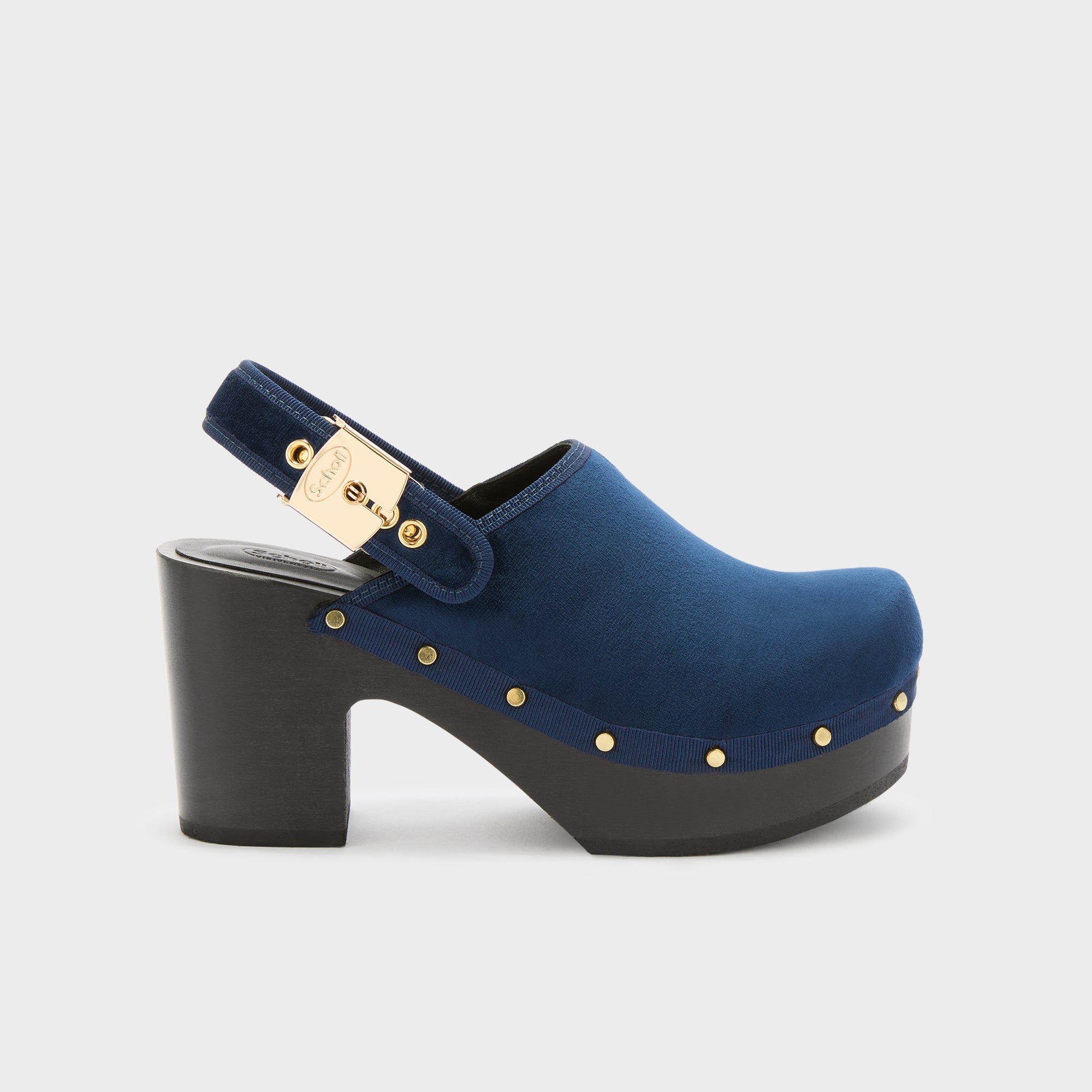 La clásica Pescura, símbolo del estilo de Scholl desde 1956, se viste con el terciopelo de ViBi y se enriquece con un ribete de grosgrain tono sobre tono, evocando el detalle distintivo de las tradicionales zapatillas friulanas y dando vida a dos creaciones únicas. Pescura Lola, en azul medianoche, presenta un tacón de haya de 9 cm y una correa trasera con la icónica hebilla oversize de Scholl.