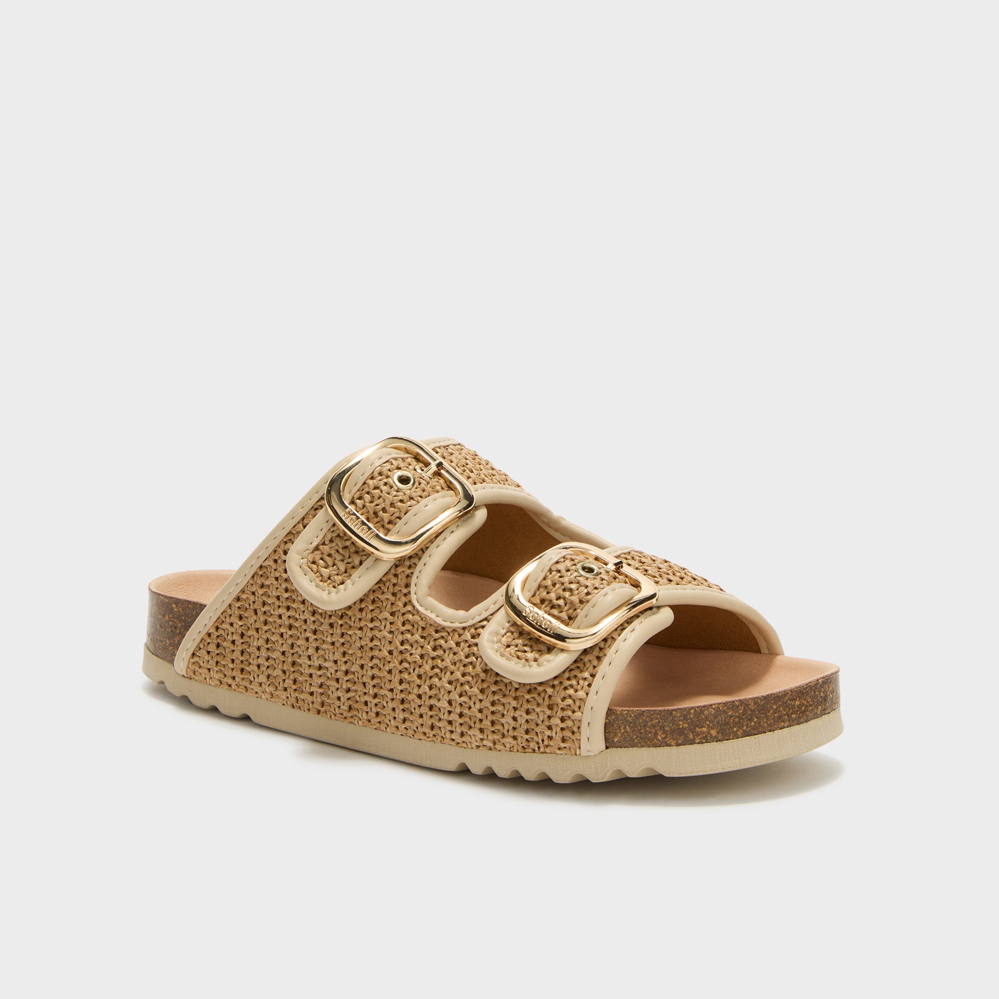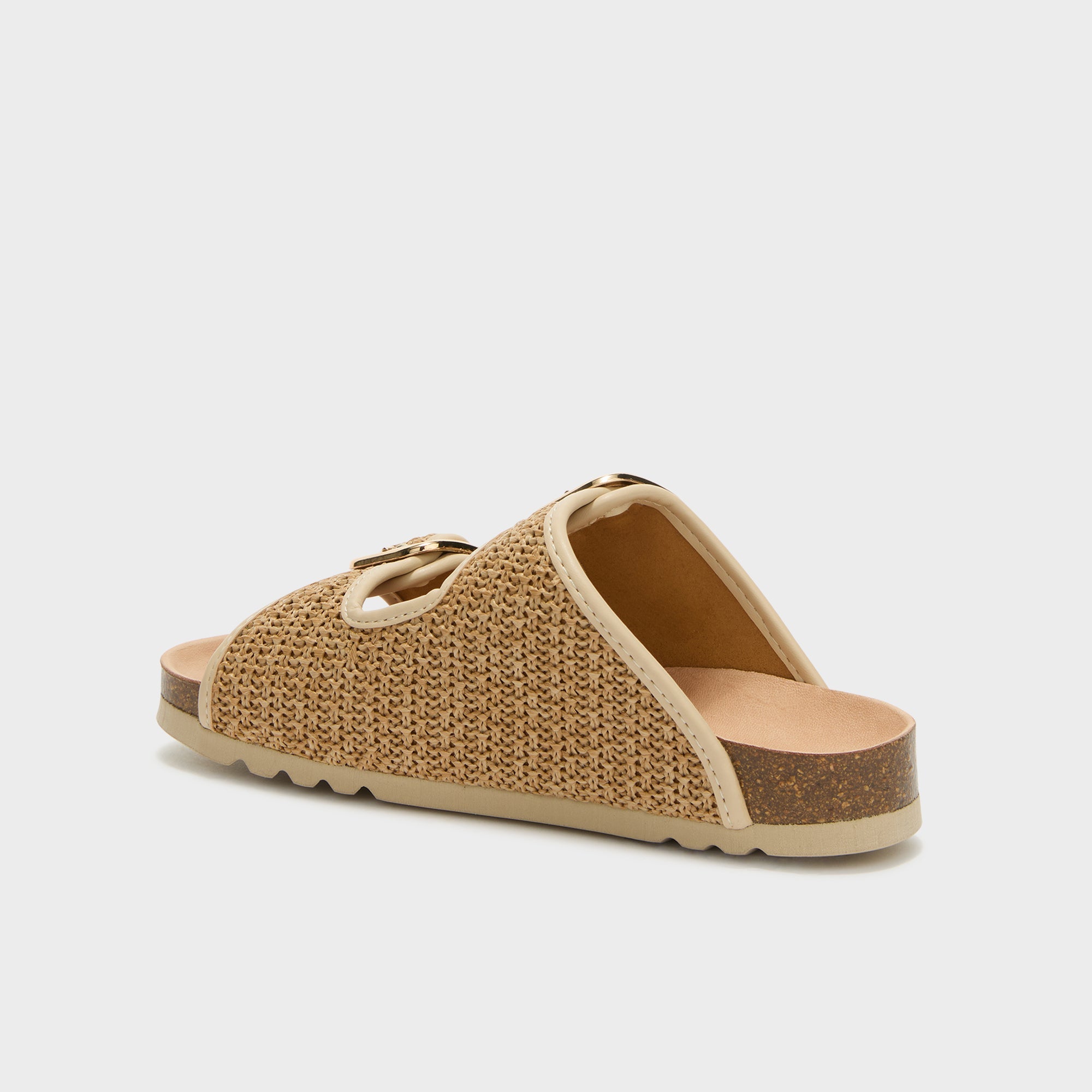 Sandalo a due cinturini regolabili per una calzata sicura e personalizzabile. Il plantare in sughero si adatta alla morfologia del piede, garantendo maggiore stabilità e sostegno.