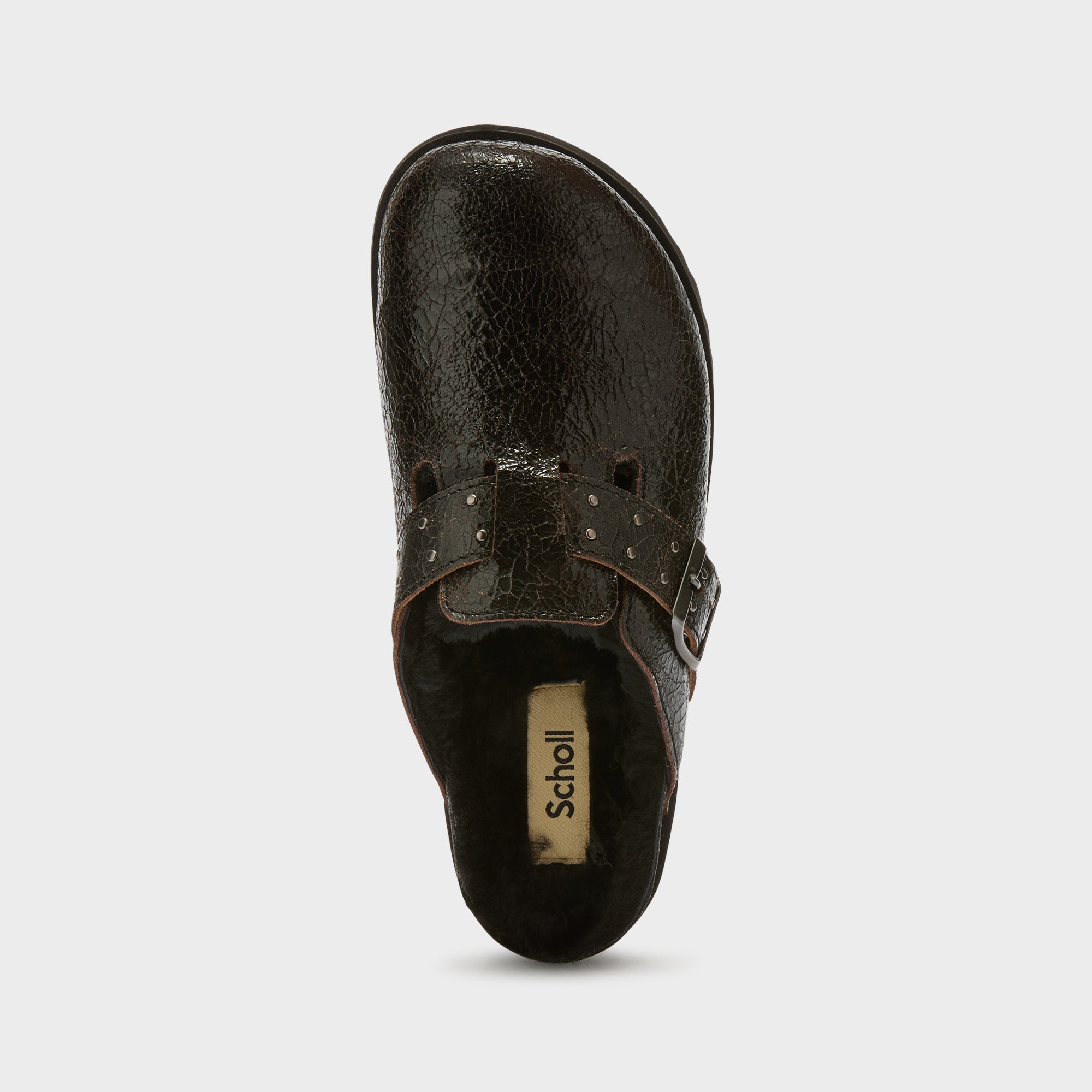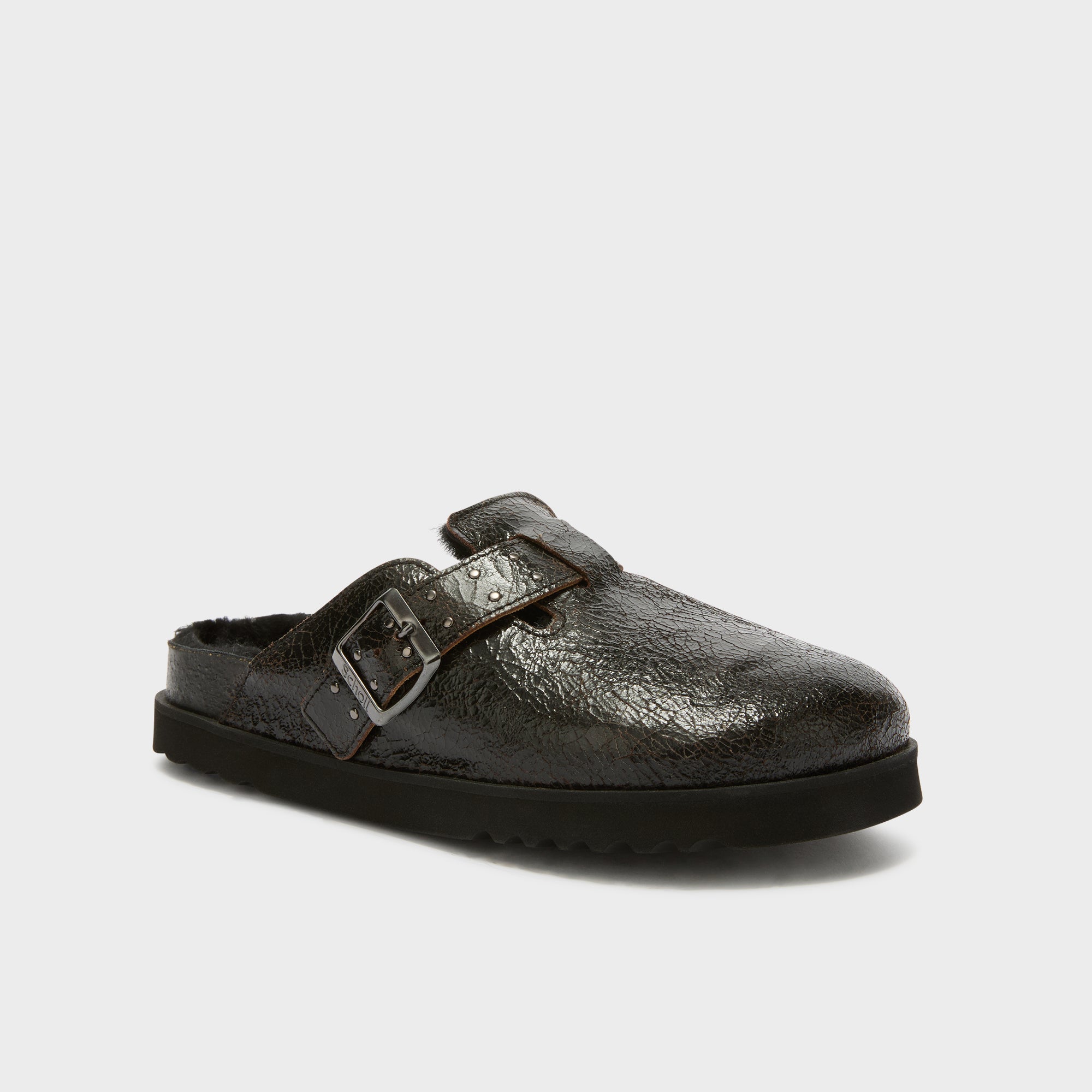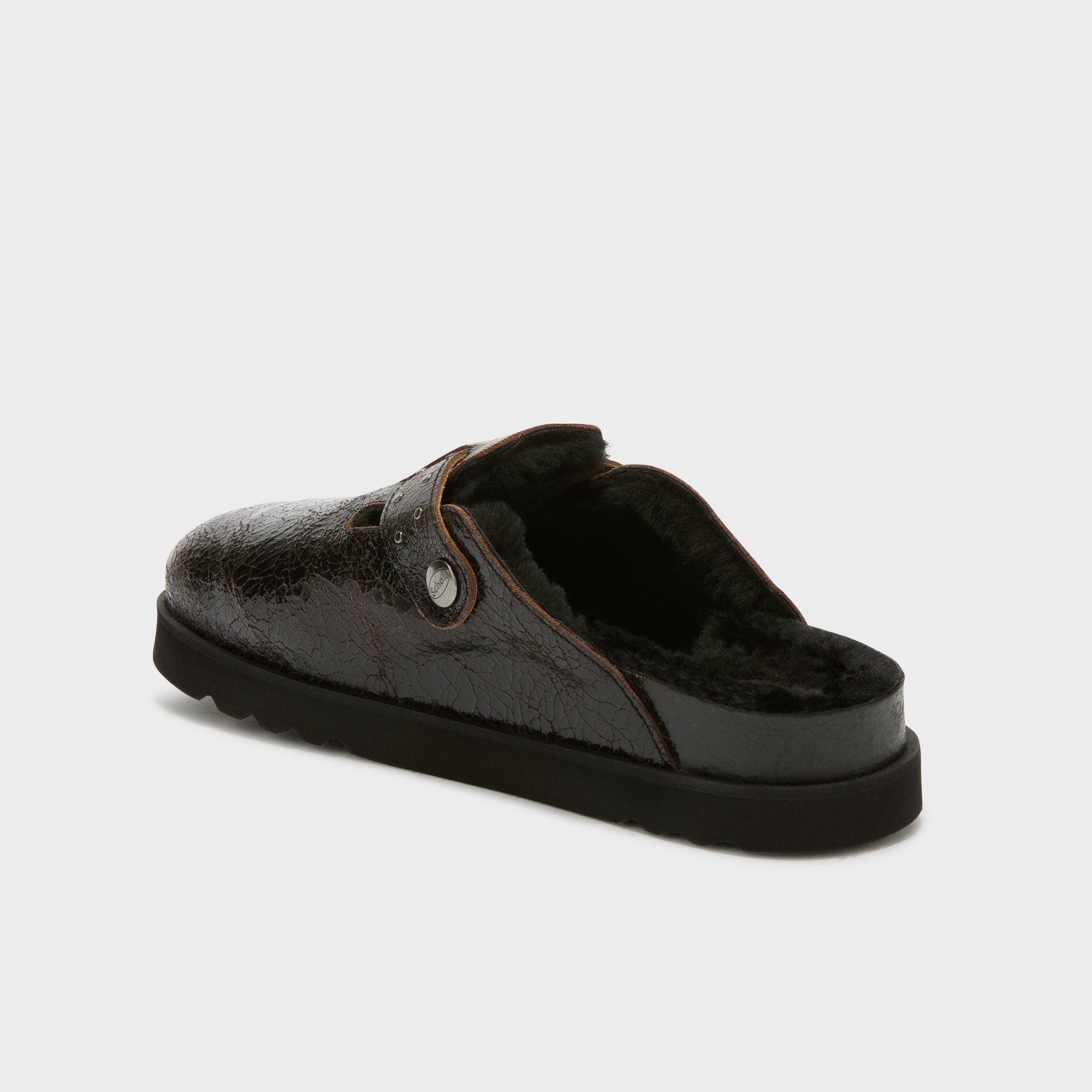 Slip-on mule featuring a crackle laminated leather upper and a soft faux-fur lining for enhanced warmth and comfort. It’s the perfect blend of edgy style and cozy functionality, ideal for colder days.