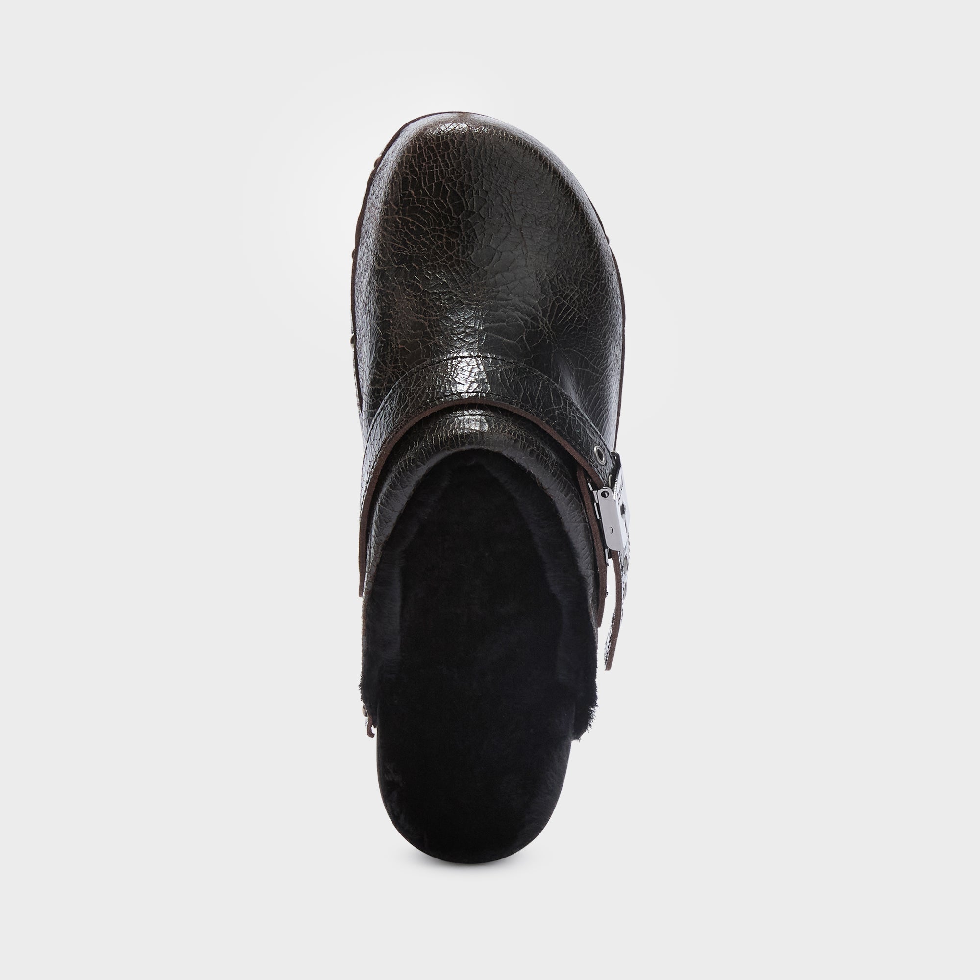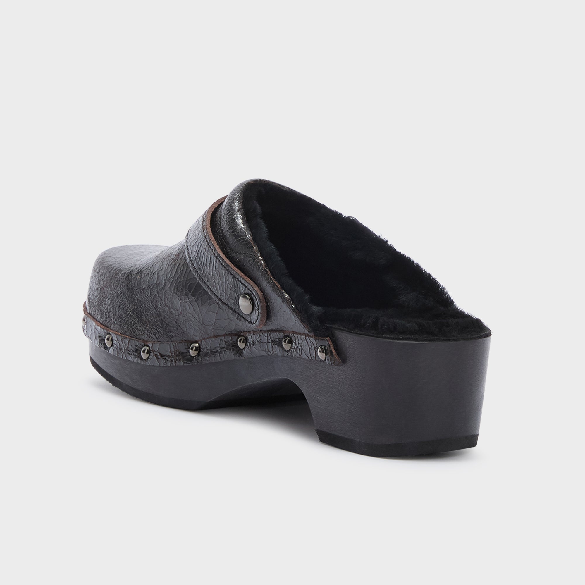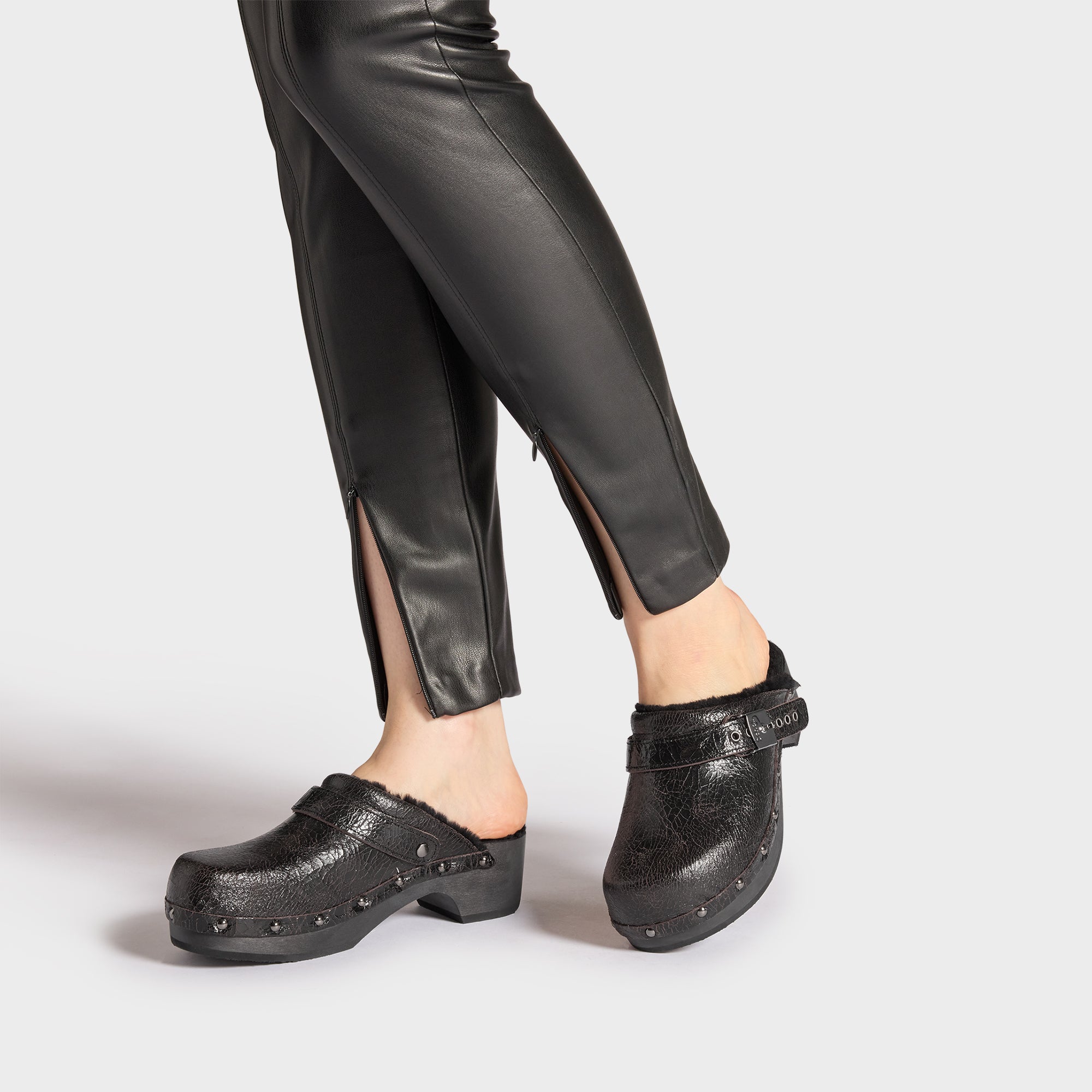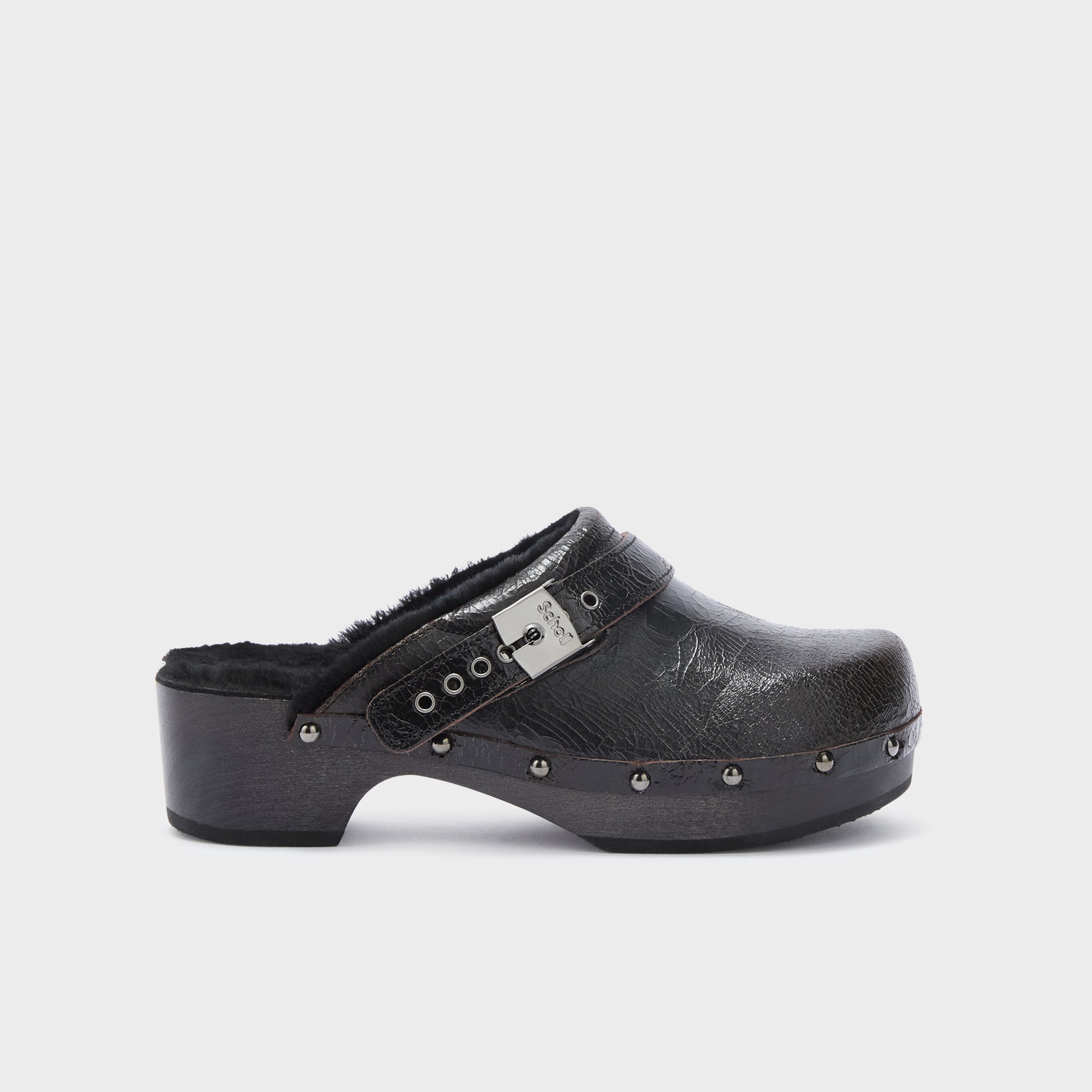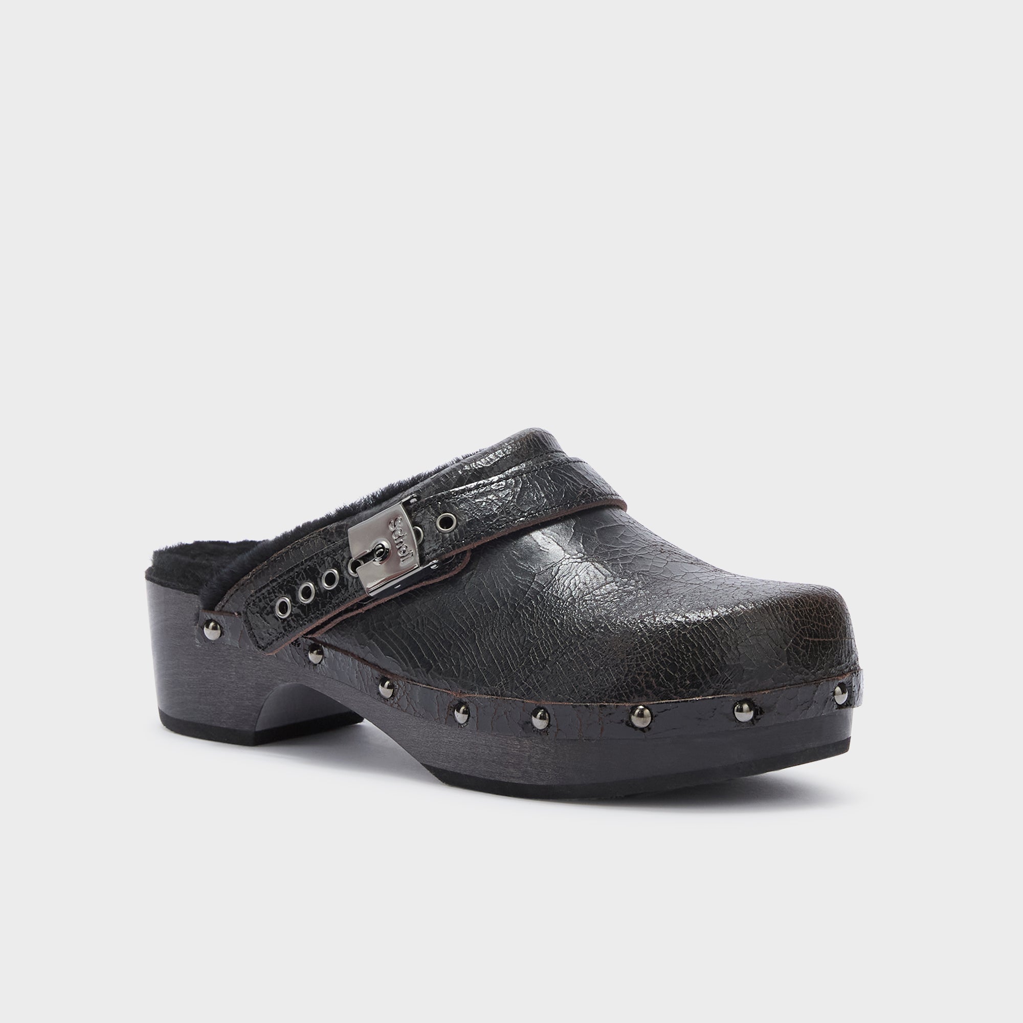 This black leather clog by Scholl features a distinctive crackled finish that adds depth and character to the design. The upper is paired with a warm shearling lining, offering both style and comfort. The adjustable strap with metallic buckle provides a secure fit, while dark-toned studs add a bold edge.